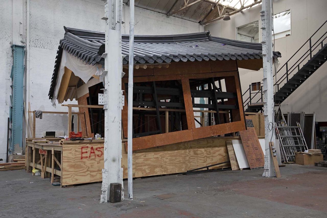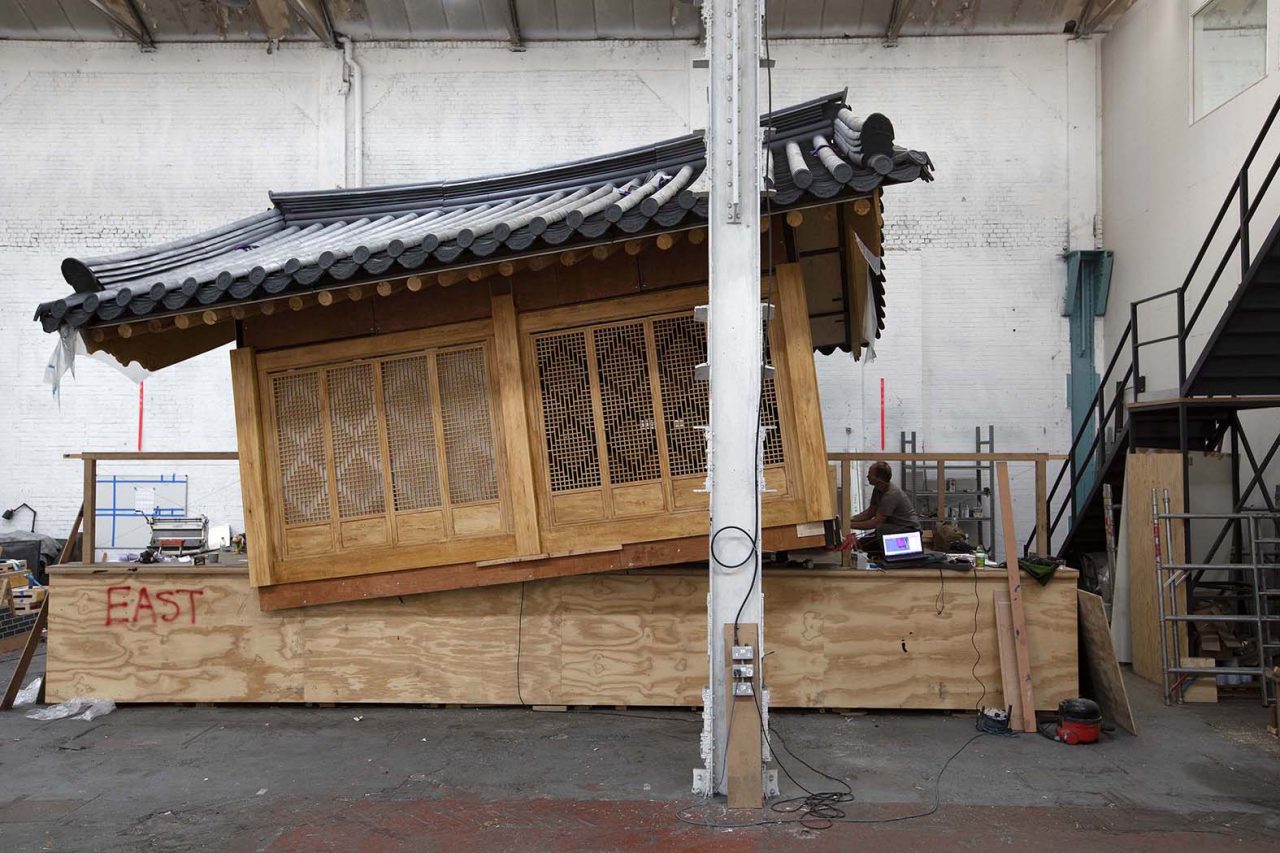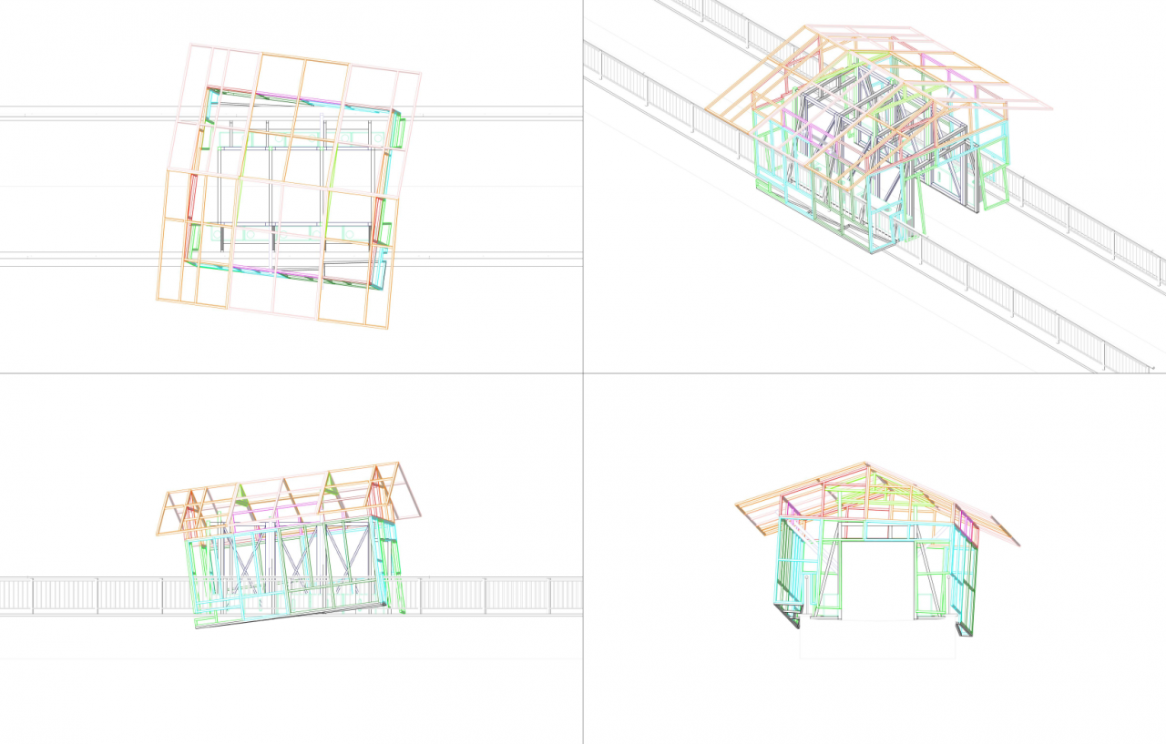 ‘Bridging Home’ is an artwork structure modelled after artist Do Ho Suh’s family home. The sculpturework is installed on a pedestrian overpass over a major carriageway at London Liverpool Street. The artwork sits at an angle and offset to the bridge, allowing views from ground level and from upper storeys of neighbouring buildings. The self-supporting steel structure is clad in carved and finished wooden walls and panels decorated with traditional Korean calligraphy. PFC moulding recreates detailed Korean roofing and the garden is made of an artificial bamboo arrangement. Lights are installed on a timer to create the illusion that “somebody’s home” after dusk.