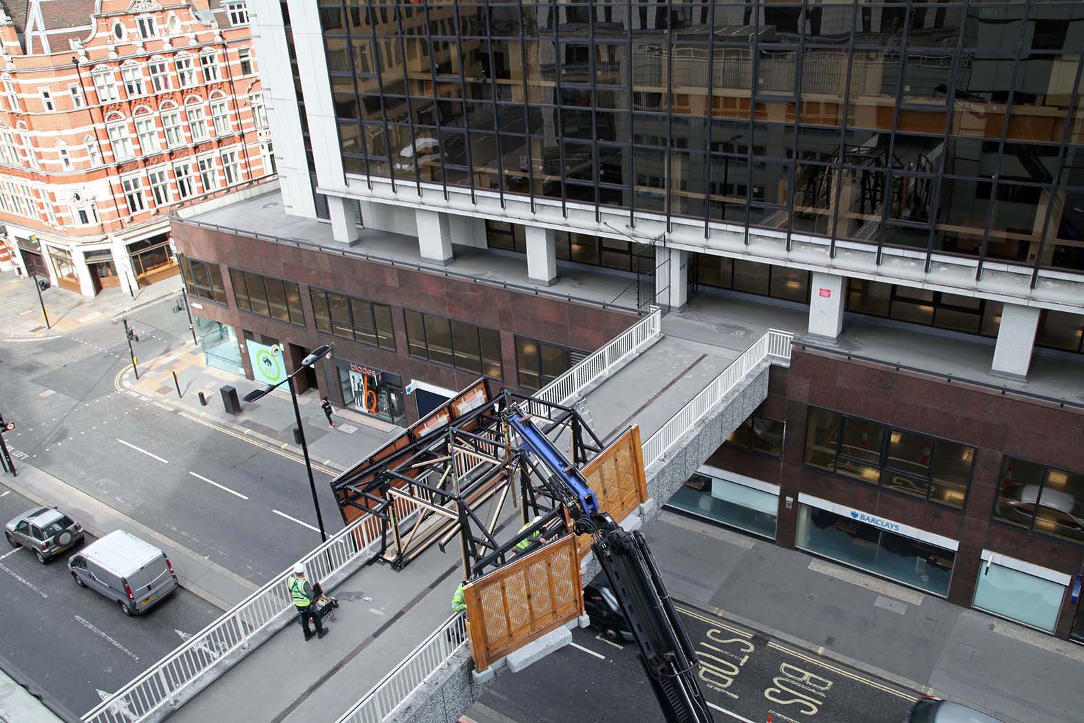 The work was entirely designed and fabricated at the White Wall Workshops under EN1090 structural regulations, then delivered and installed over a dual carriageway in the City of London. Extensive engineering and research into the appropriate materials was required to ensure that the artwork would not exceed the pedestrian bridge weight loading whilst remaining weatherproof and durable through exposure to high winds.