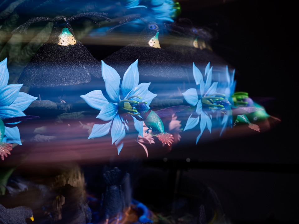 Production design and fabrication of the ‘The Centrifugal Soul’ zoetrope: a kinetic artwork made of a welded steel framework, CNC cut aluminium location discs, electronic and mechanical components, and hand painted 3D printed nylon. A central frame supports the artwork, which is powered by a 3 phase motor to trigger a strobe light sequence during rotation to create a visual effect of a static background but continuous motion of the 3D printed figures.