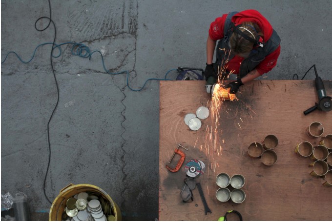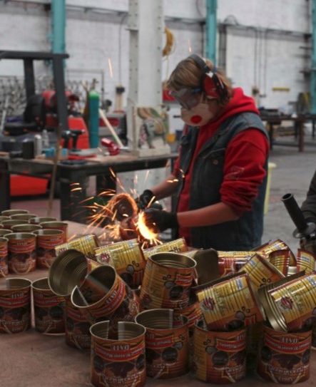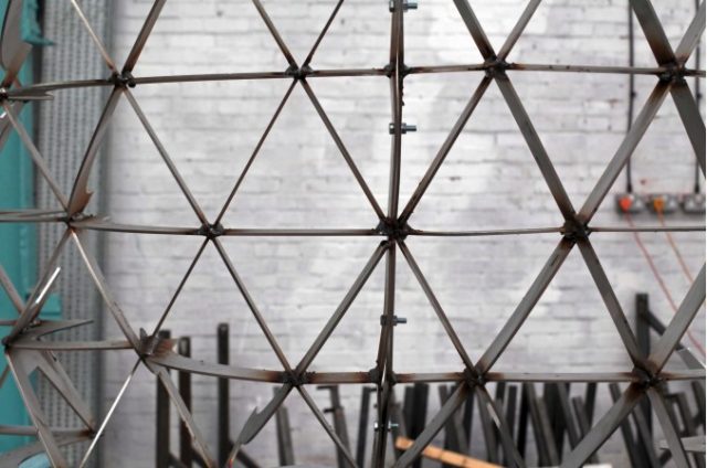 The sculpture involves a carefully engineered steel armature, steel mesh cladding, and hundreds of pressed and cut date syrup cans imported from Lebanon and Iraq.