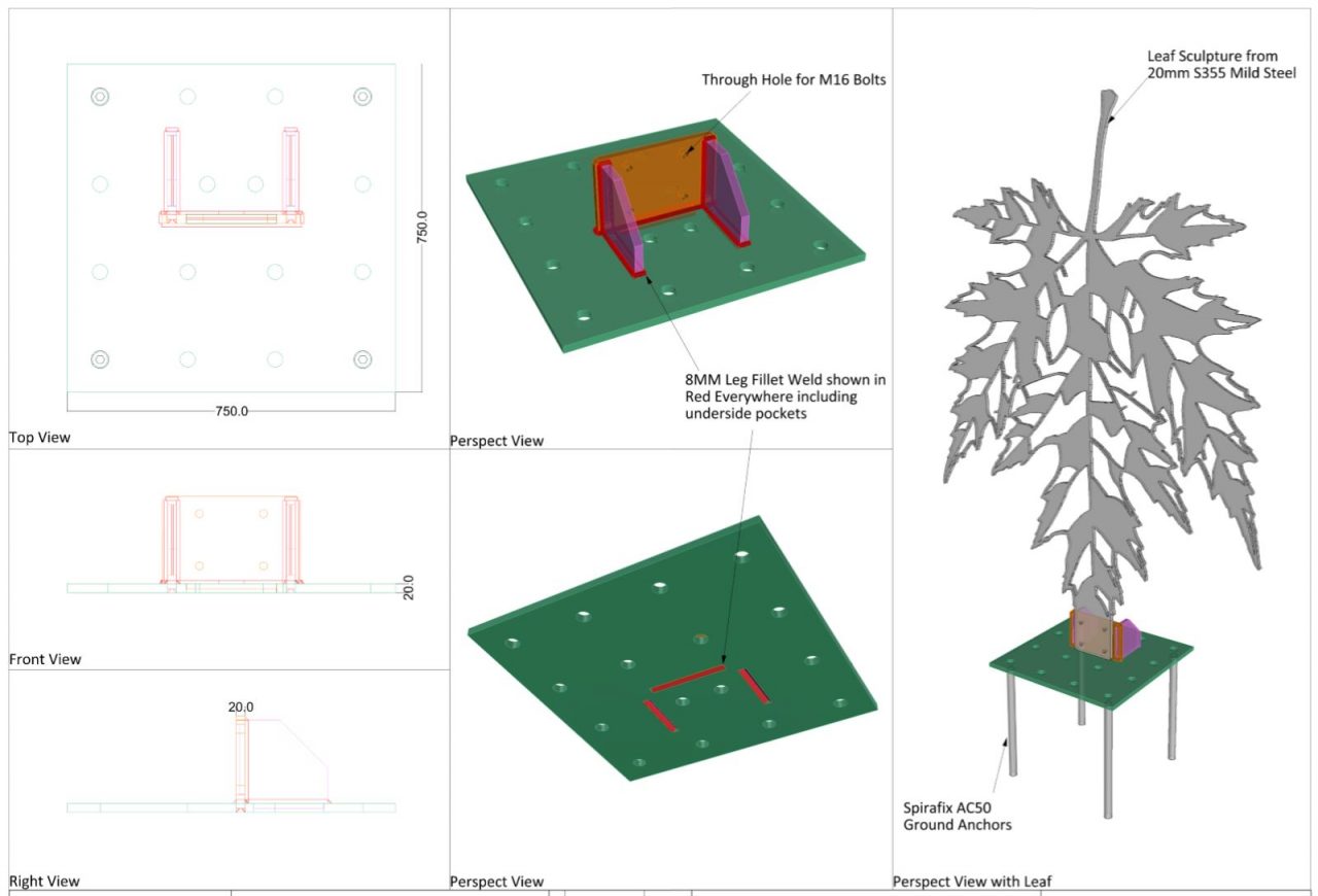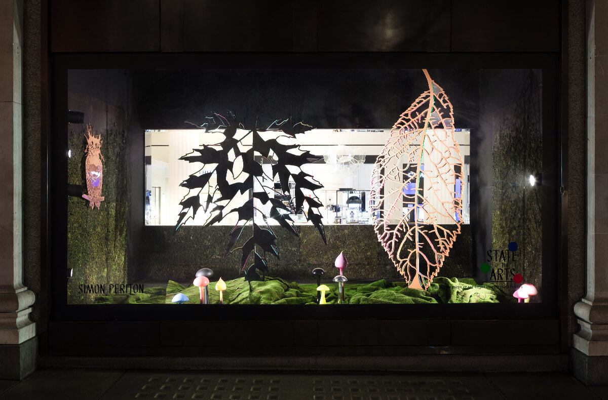 Welded watercut steel frame with galvanised support, bespoke plinths, and colour spray finish to inside faces. The ‘Leaves’ were fabricated for Selfridge’s ‘Crossrail’ window display in January 2019.